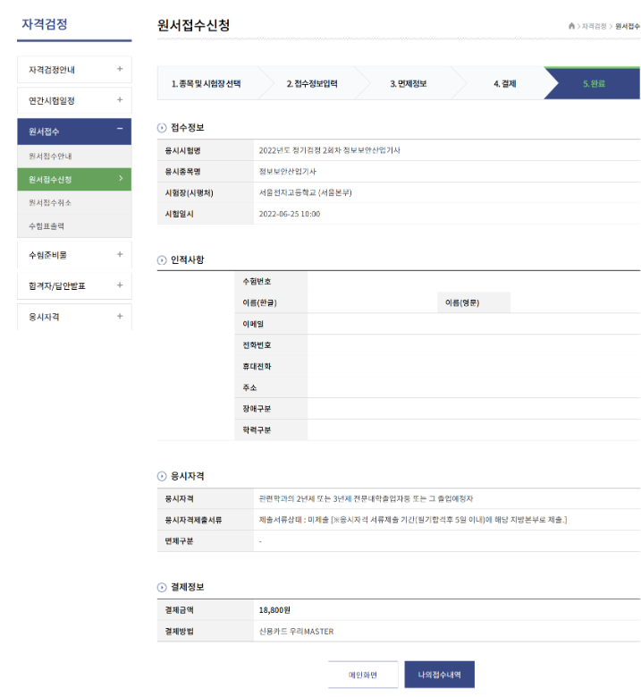결제 완료 되면 원서접수가 끝난다.