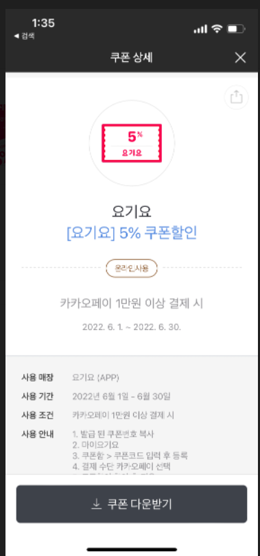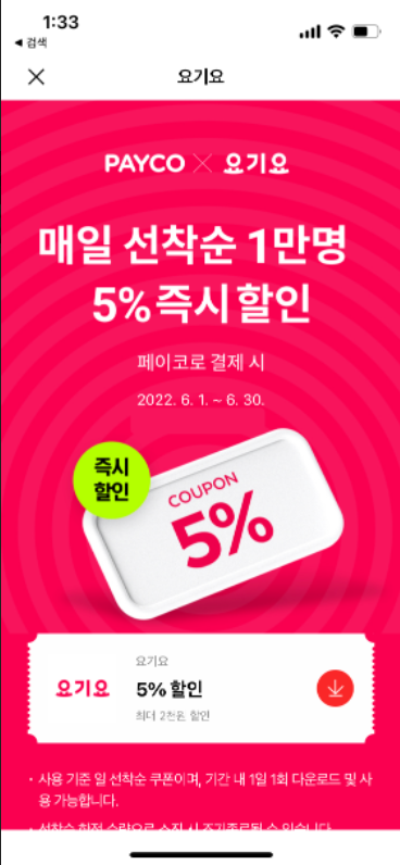 1일 1회 다운로드 1만원 이상 결제시 5% 할인, 기간내 1회 가능