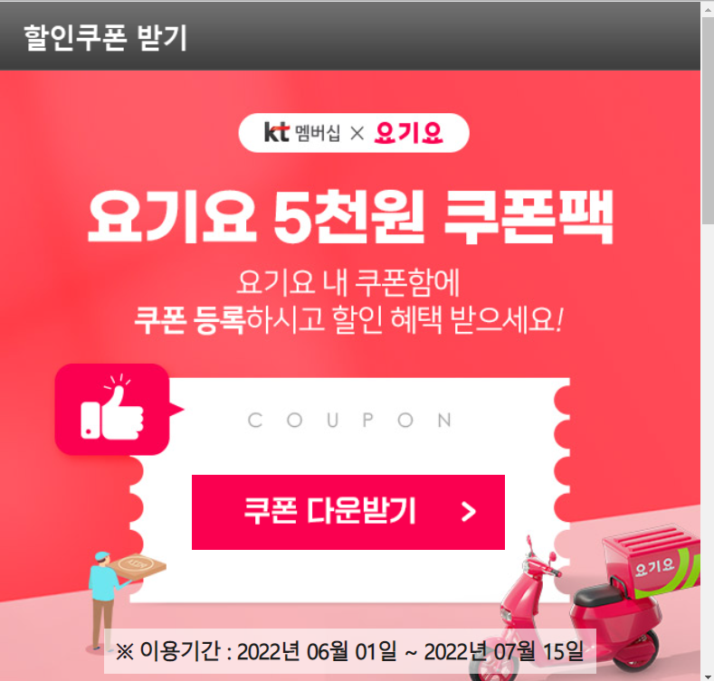 요기요 2022년 7월 쿠폰이다. 놀랍게도!!! 6월과 많이 다르다!!! 와!! 이렇게 다를 수 있을까 싶다. 모든 쿠폰이 다 내려갔다. KT 이벤트 종료.. 네이버 이벤트 종료.. 페이코 쿠폰 이벤트 종료 카카오