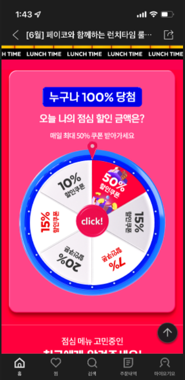 살게 있으면 미리 점심 룰렛을 돌려서 11시부터 2시까지 주문을 하자(토,일 은 룰렛이 안나온다.)