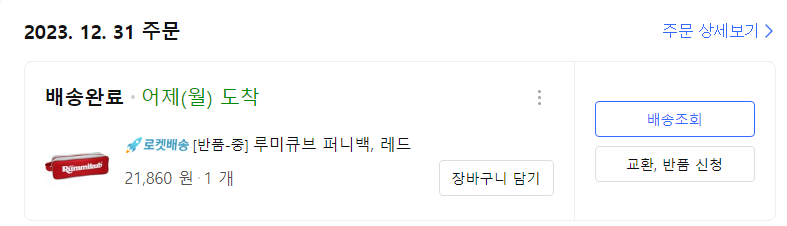 루미큐브 퍼니백 쿠팡 반품 제품 구매 후기[내돈내산] 연말에 집에서 보드 게임을 하면서 지내고 싶어서 찾아봤다. 예전부터 루미큐브 라는 게임이 재미있다고 들어서 구매 하기로 했다. 미리 구매를 하면 되는데 시간이 별로 없고 해서 쿠팡을 통해서 구매를 하려고 마음을 먹고 쿠팡으로 들어갔다. 새제품은 2만7천원대... 너무 비싸다. 2만 2~3천원이면 살것 같은데... 그러다가 눈에 보인게 반품상품이다. 들어가보니 위와 같이 반품 사유가 적혀 있다. 쿠팡 반품상품이 복불복이 심하다고 들은적이 있다. 반품상품이여도 새제품을 받을수도 있고.... 어차피 받아보고 문제 있으면 반품하면 되지 하고 구매를 했다. 오후 2시 정도에 배송 완료 문자가 왔다. 두근두근 상태가 어떨까 하고 열어보니 걷 상태는 괜찮았다. 새..