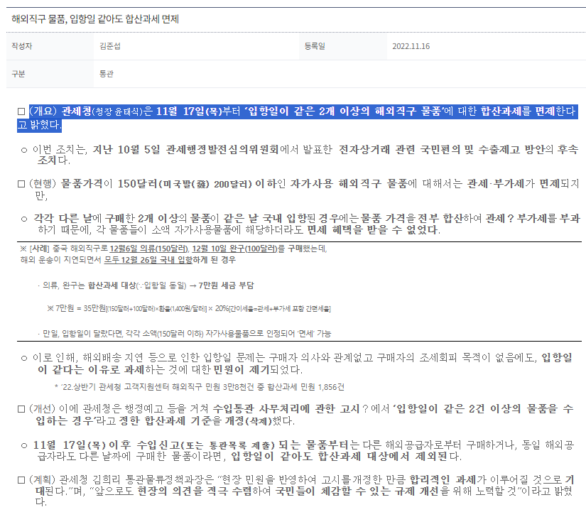 합산과세 폐지[2022/11/16] 나만 몰랐다 ㅠ.ㅠ https://www.customs.go.kr/kcs/na/ntt/selectNttInfo.do?mi=2891&nttSn=10069842 솔직히 몰랐다. 200달러 미만 관세가 면세되었던게 150달러로 낮춰진것만 알았지 합산과세도 면세 되는지 몰랐다. 예를 들어 기존의 합산과세는 100달러 아마존구매, 120달러 이베이 구매를 했는데 마침 한국으로 들어오는 날이 같은 날이고 통관도 같은날 들어오게 되면 100+120 총 220달러가 신고가 되어 과세를 냈다면 변경된 과세는 똑같이 100달러 아마존 구매, 120달러 이베이 구매를 했다면 각기 다른 사이트에서 구매를 했기때문에 한국으로 같은날 들어와도 합산과세가 안된다고 한다. 이걸 몰랐다.. 직구 할..