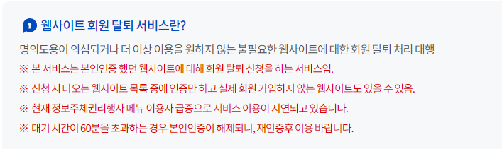 웹사이트 회원탈퇴 한번에!! https://www.privacy.go.kr/front/wcp/dcl/per/memberSecStep1.do 웹사이트 회원 탈퇴 서비스를 개인정포탈이라는 정부기관 사이트에서 서비스를 해주고 있다. 위 사이트 가서 동의 하고 다음 눌러서 개인 인증하고 나면 대기자가 많다... 6시간 06분...? 서버가 문제 있는지 예상 시간은 저렇게 떴지만 10분 정도 후에 가입사이트가 나와 있다. 94개나 가입 되어 있네;;; 사이트 맨밑에 웹사이트 회원탈퇴 신청이 떠 있다 이걸 누르면 탙퇴 가능한 사이트와 탈퇴 불가능 한 사이트로 나눠지고 탈퇴 가능한 사이트는 체크 하고 탈퇴 신청하면 한번에 탈퇴가 가능하다. 탈퇴 불가 사이트들은 위와 같은 이유로 불가능하다고 하는데 한꺼번에 다 해주면..