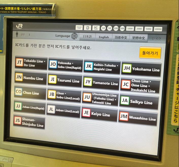 일본 도교 지하철 티켓 구매 방법처음에 일본 지하철 탔을때는 어리버리 했다 티켓을 뭘 끊어야 하지?? 내가 가야 할곳이 어디인데 이건 어디있지??생각보다 간단하다. 내가 하라주쿠를 가야 한다면 라인을 먼저 확인하자.JY 라인이고 넘버가 19번이다.JY 들어가서 19번 보면 하라주쿠라고 적혀 있다.눌러서 결제를 하면 된다.참고로 거의 대부분 지하철 표 자판기는 현금만 되고 가끔 카드가 되는 기계가 있긴 한데 내가 가져간 토스 카드는 결제가 안됐다.그리고 구글맵을 잘 이용하자 이동할때 플랫폼 어디에서 타야 하는지 잘 나와 있다.
