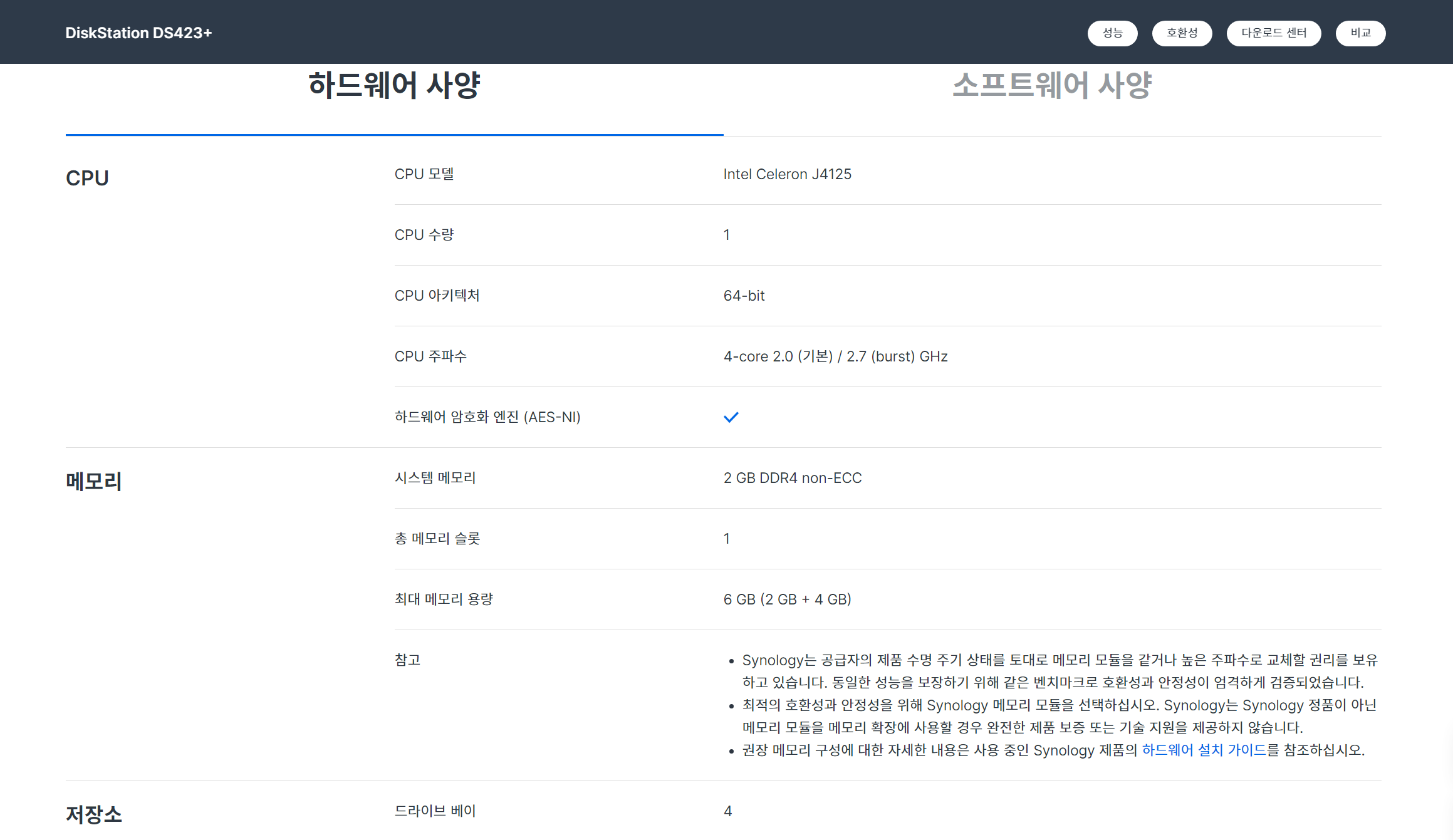 Synology DS423+ 구매 후기기본 스펙은 위와 같다. 정품 스티커가 붙어 있다.(직구는 A/S 가 불가능인가..?)미개봉씰 정도는 붙여 줄수 있지 않나..? 아쉽다.전원아답터, 랜케이블본체! 부직포 같은거에 넣어져 있다.영롱하다 ㅎ메모리 슬롯이 안쪽에 있다.뒷면 랜포트2개 전원, USB 3.0 단자 하나 있다.SSD 2TB x 4 장착 할 예정이다.3.5 , 2.5 장착 가능하다. SSD 는 이렇게 장착 하면 된다.장착 다 끝나고 홈페이지에 가서 synology assistant 다운 받아서설치 해주면 된다. 그리고 PC 와 NAS 에 랜카드 연결해주면이렇게 장비가 뜨는데PC 에 있는 DHCP IP 를 고정IP 로 변경하면NAS 장비에 접속이 가능하다.이제 가이드대로 설정 해주면 작업이 끝난다...