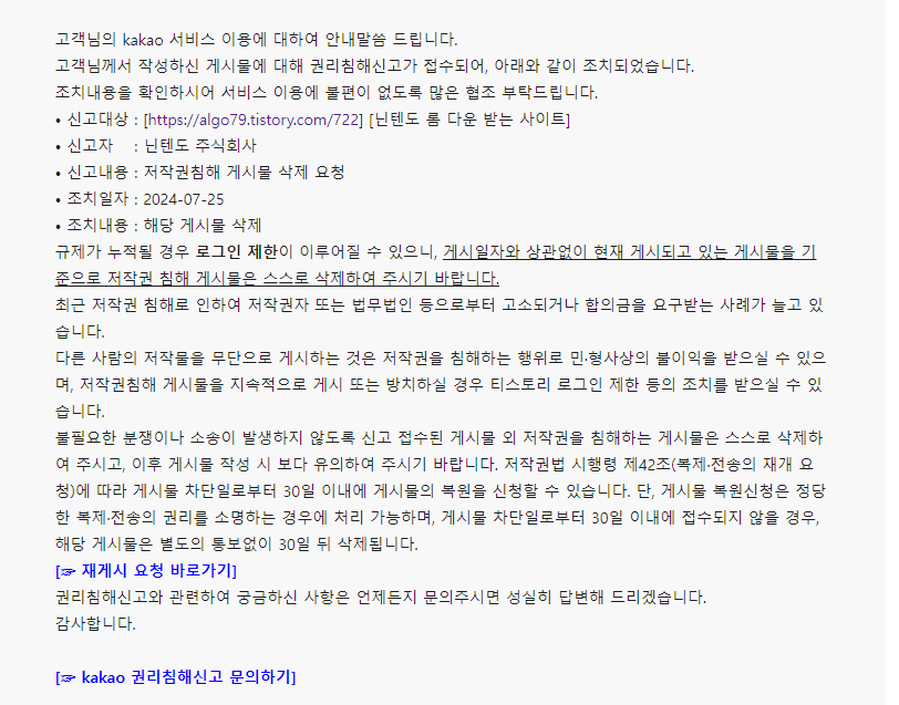 닌텐도 롬 다운 받는 사이트 삭제 닌텐도 롬 다운 받는 사이트 삭제ㅎㅎㅎㅎ 참 웃긴다.검색만 해도 나오는 사이트들 링크만 걸어놨는데 위와 같이 메일이 오고해당 게시글은 삭제가 되었다. 뭐 규정이 이렇다면 할만은 없는데 검색하면 나오는 사이트들인데... 참 이해가 안간다. 뭐 여튼 요청한대로 해당 게시물 삭제 완료! 닌텐도 2024.07.26
