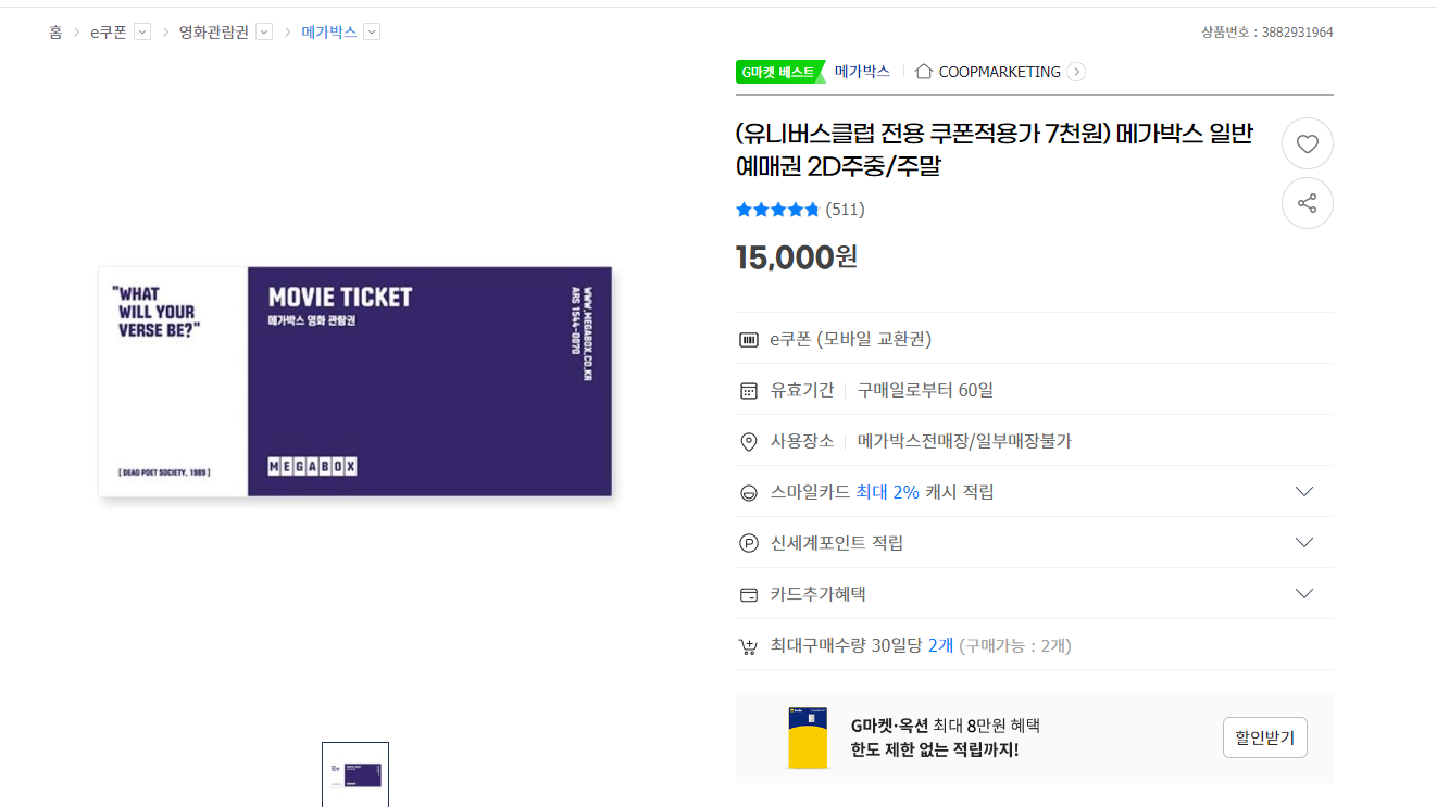 메가박스 예매권 사용방법https://item.gmarket.co.kr/Item?goodscode=3882931964 G마켓-(유니버스클럽 전용 쿠폰적용가 7천원) ...15,000원item.gmarket.co.krG마켓에서 유니버스 클럽 전용으로 메가박스 영화 예매권을 저렴하게 판매 한다.(뭐 언제까지 이렇게 팔지 모르겠지만.. 좋다.)메가박스에 들어가서 로그인하고 빠른 예매로 들어가면메가박스 포인트 쿠폰에 모바일 관람권이 있다. 이걸 선택하고관람권번호를 입력을 하고 사용을 체크 하면이렇게 예매가 가능하다.하이재킹 뭐... 킬링타임용으로 볼만하다.