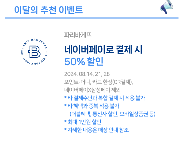 파리바게뜨 네이버페이로 결제시 50% 할인 이벤트 8월 매주 수요일(14일부터, 21, 28) 파리바게뜨 현장 QR 결제시 50% 할인 들어간다(최대 1만원할인) # 네이버페이X삼성페이 제외다.요즘 하도 빵값이 비싸서.. 이런 이벤트는 좋은듯 하다. 늦게 가면 빵이 없을 확률이 크니 빨리가자. 자세한 내용은 아래 링크 참고하자.https://m.post.naver.com/viewer/postView.naver?volumeNo=38160959&memberNo=30633733 여름을 부탁해! 8️⃣월 이달의 이벤트[BY 네이버페이 포스트] [ 이벤트 공통 ] · 제휴사별 혜택/기간이 다르므로 유의해 주세요. · 네이버페이...m.post.naver.com
