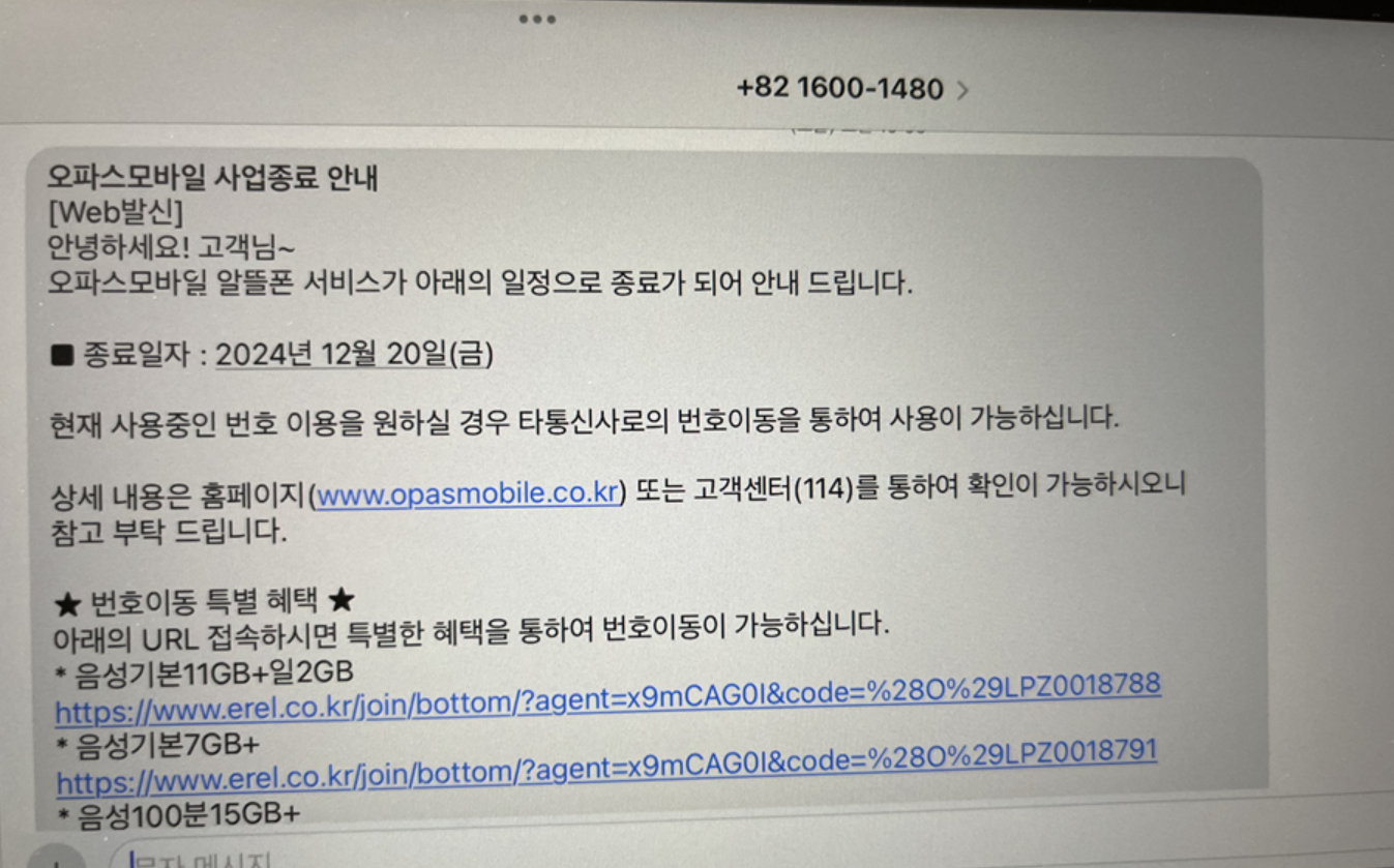 오파스모바일 사업종료 안내 오파스모바일 사업종료 안내오늘 갑자기 오전에 위와 같이 문자가 왔다. 뭐지..? 뭐 유명한 알뜰은 아니여도 꽤 썼던것 같은데 하고 홈페이지에 들어가보니이렇게 팝업이 뜬다. 2024년 12월 20일자로 서비스 종료라고많은 알뜰폰 사업자들이 생겨나고 이렇게 망하고 하는듯 하다. 많은 업체가 경쟁을 해야 소비자는 저렴한 요금제를 쓸수 있는데 살짝 아쉽다. 슬슬 또 번호 이동 준비를 해야겠다~ 알뜰 2024.09.27