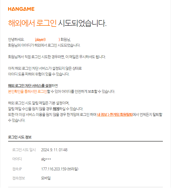 한게임 해외 로그인 차단 서비스 설정 방법어느날 메일이 위와 같이 왔다.한게임 계정이 해외에서 로그인 시도가 있었다고. 한게임이라... 로그인 안한지 꽤 오래 된것 같은데.... 혹시 모르니깐 해외 로그인 차단 서비스를 설정하자.해외 로그인 차단 서비스는 한국이 아닌 다른 나라에서 접속을 차단 하는 서비스 이다. 만약에 내가 해외에 나가서 게임 할 일이 없다면 무조건 하면 좋다.https://hmember.hangame.com/myinfo/myinfo.nhn?menuId=main 로그인 | 한게임 accounts.hangame.com한 게임 로그인 후 왼쪽 아래 해외 로그인 차단 가입하기를 누르면 된다.(난 이미 설정을 했기 때문에 해지하기로 표현된다.)그리고 추가로 한게임 OTP 도 같이 설정 해주면 ..