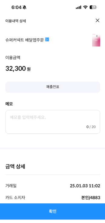 신용카드 결제 영수증 조회가끔가다가 결제를 했는데 어디서 한지 모를때가 있다.G마켓이나 쿠팡 혹은 어디음식점등 이름이 적혀 있는데가 있는데 없는곳이 있다 이럴때 결제 사이트 가서 확인 할수 있다. 카드 영수증상으로는 이렇게 뜬다 슈퍼커넥트?세부 내역을 보면 갤럭시아머니트리(주) 라는곳이라고 적혀 있다. 갤럭시아머니트리 와 승인번호만 있으면 조회 가능하다.갤럭시아머니트리 결제내역 조회https://www.billgate.net/billgate/center/paymentlist.do 빌게이트 - 통합 전자결제 서비스빌게이트, 다양한 결제수단으로 안전하고 편리하게 결제할 수 있도록 지원하는 전자지불 서비스입니다.www.billgate.net위 사이트 가서승인 번호 날짜 결제 금액 하고 결제내역 조회를 하면이..