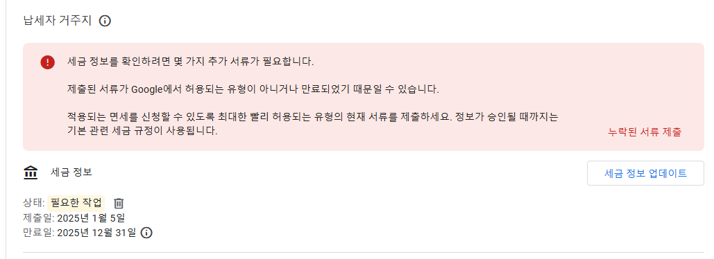 제출된 서류가 Google에서 허용되는 유형이 아니거나 만료되었기 때문일 수 있습니다.https://algo79.tistory.com/1738이전에 위 링크처럼 해서 세금정보 등록을 했었는데 또 떠 있었다. 아마 주기적으로 해야 하는듯 해서업데이트를 했다. 하지만계속 위와 같이 추가 서류가 필요하다고 에러 뜬다. 업데이트를 3번정도 했는데 계속 무한반복이다.그러다가 문득만료날짜가 변경되어 있다. 어라 내가 서류를 올렸을때는 2024년 12월 31일이였는데 올리고 서류심사 받는데 2025년이 지났던것이다.혹시나 해서 과세연도를 2025년껄로 다시 받아서 올려봤다.과연!!!!수락되었다.! 요청한 해 기준으로 받아야 수락된다.