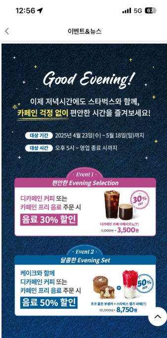 스타벅스 굿이브닝 이벤트 https://algo79.tistory.com/1686 스타벅스 반값 할인 축소~https://n.news.naver.com/article/374/0000370567?cds=news_edit 스타벅스 '반값 할인' 없앤다…무료쿠폰도 축소 스타벅스가 다음 달부터 고객혜택을 대폭 줄입니다. 저녁 시간 반값 할인을 없애고, 무료쿠폰 제algo79.tistory.com예전에 이브닝푸드 이벤트가 진행을 했었는데 소리소문 없이 없어졌다.다시 이벤트 시작! 뭐 조금 다르긴 한데 디카페인 한해 오후5시 이후 음료만 30프로 음료+케익 하면 음료만 50프로 할인 이벤트 중이다.2025-04월 23일 ~ 5월 18일까지 진행 한다.이벤트 음료가 한정적이라 확인 후 결제를 해야 한다.여기 나와 있..