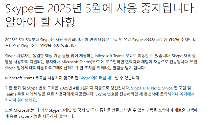 Skype 2025년 5월에 사용 중단Microsoft 가 MSN 으로 메신저를 사용하다가 Skype 로 통합이 되었었다.Skype 대중적으로 인기가 많이 끌었던건 국제전화가 꽁짜로 사용이 가능해서 많은 사람들이 썼었다. 하지만 프로그램이 너무 무겁고 비슷한 종류의 프로그램들이 많이 나오고 경쟁이 안되다 보니 이렇게 서비스가 종료가 된게 아닌가 싶다. MS 에 Teams 도 서비스 종료에 일조를 했을것이다.서비스는 2025년 5월 5일에 종료되나, 스카이프의 친구나 채팅이력 및 크레딧 등은 Teams로 무료로 전환이 가능하다고 한다. 혹시 크레딧이 있다면 전환을 하자. 오랫동안 사용해왔던 Skype 가 서비스 종료가 된다니 아쉽다.
