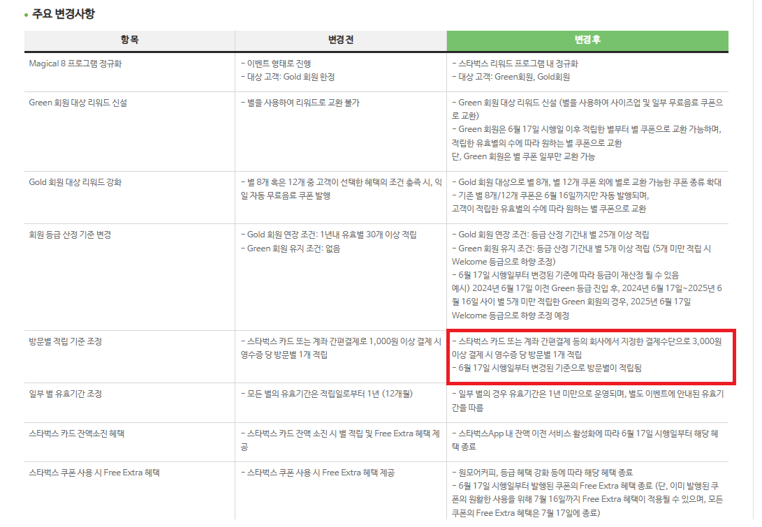 스타벅스 혜택(별적립 금액 1,000원 -> 3,000원) 축소 6/17일부로 ㅎㅎㅎㅎㅎㅎㅎㅎㅎ 와.. 스벅 혜택이 가면 갈수록 미친듯이 안좋아진다. 스벅 가는 사람들이 보통 기프티콘 받아서 가는 사람이 대분이고 1잔먹는김에 1,000원 추가해서 별 적립을 할텐데.. 최소 금액을 3,000원으로 올리면 1잔은 별을 안주겠다라는 의미다. ㅎㅎㅎ별 유효기간도 1년 미만으로 줄어들고..이것도 없어지고 다 안좋아진다.아.. 하나 좋아지는게 골드회원에서 그린회원까지 확대~ ㅎㅎㅎㅎㅎㅎㅎ 참.... 이렇게 안좋아지다니.. 참 안타갑다.
