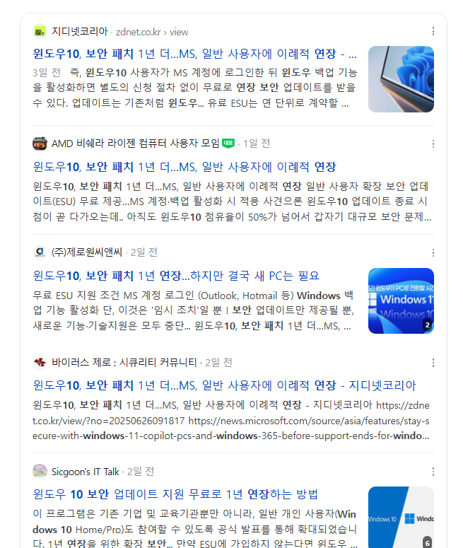 윈도우(windows) 10 지원(보안 패치) 1년 무료 연장원래는 윈도우10 지원이 2025년 10월 14일 종료된다고 공지를 했었다.하지만 연장한다고 다시 발표.. 뭐 윈도우7 보면 답을 알 수 있다. 윈도우7도 종료 한다고 했지만 지속적으로 연장을 해줬기 때문에 솔직히 바로 지원 종료 안할것을 알고 있었다.근데 웃긴게 30달러 받고 보안패치를 해준다고 했었나보다. 이걸로 장사를 하려고 했네...여튼 1년 연장인데 자동으로 해주는게 아니고 별도로 연장 활성화 해줘야 된다고 한다.역시 귀찮게 해서 윈도우11로 넘어가게 하려는 꼼수인듯 보인다. 기업에서는 미리 준비 해서 보안패치 연장을 해야 할듯 하다.