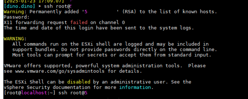 esxi 콘솔 장비에서 ssh 접속이 안될때 esxi 콘솔 장비에서 ssh 접속이 안될때esxi 콘솔로 접속 후에 해당 장비에서 다른 장비로 ssh 접속하면 기본 설정으로는 접속이 안된다.# esxcli network firewall ruleset set -r sshClient -e true명령어를 입력하면 접속이 된다. esxi 2025.01.30