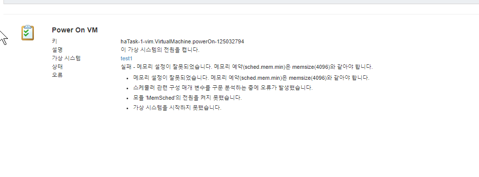 메모리 설정이 잘못되었습니다. 메모리 예약(sched.mem.min)은 memsize(4096)와 같아야 합니다. esxi 설정할때 위와 같이 에러가 발생 한다면 메모리 앞에 아이콘을 눌러서 확장하고 예약 메모리도 동일하게 잡아주면 정상적으로 부팅이 된다. esxi 2021.07.13