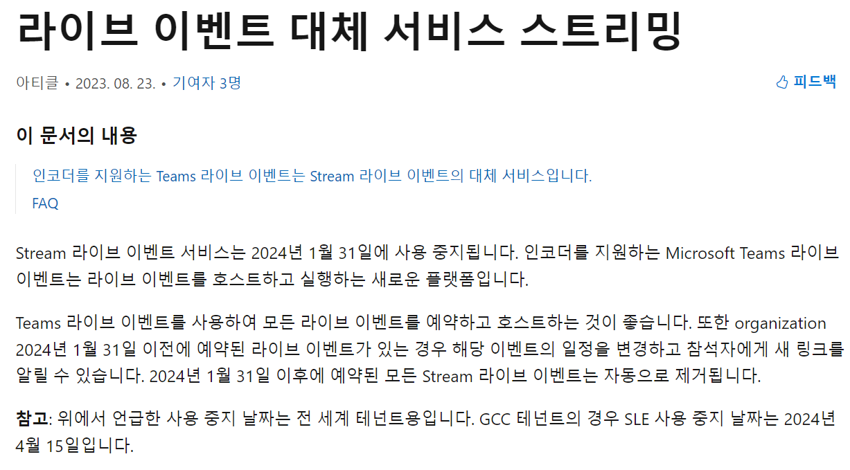 Microsoft Stream(Classic) 마이그레이션 to sharepoint Microsoft Stream(Classic) 마이그레이션 to sharepoint Stream 라이브 서비스가 1월 31일에 사용 중지 된다. 그래서 기존에 Stream 을 사용을 하고 있다면 MS 다른 플랫폼으로 전환 작업을 해야 한다. https://admin.microsoft.com/#/featureexplorer/migration/StreamMigration/ https://admin.microsoft.com/#/featureexplorer/migration/StreamMigration/ admin.microsoft.com MS가 마이그레이션을 지원해준다. 위 사이트를 접속을 하자. (당연한거지만 전역관리자 권한이 있어야 한다.) 이렇게 뜨고 조금 있으면 가지고 있는 컨테이너가 나온다. 만약에 .. office 2024.01.29
