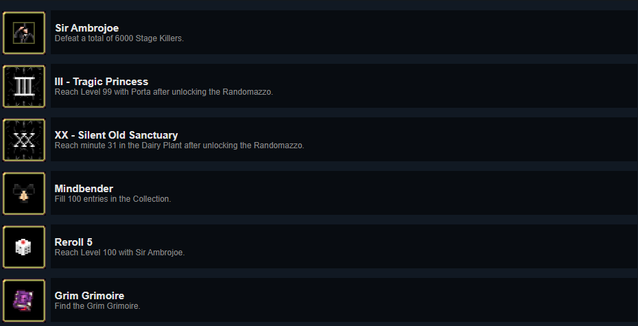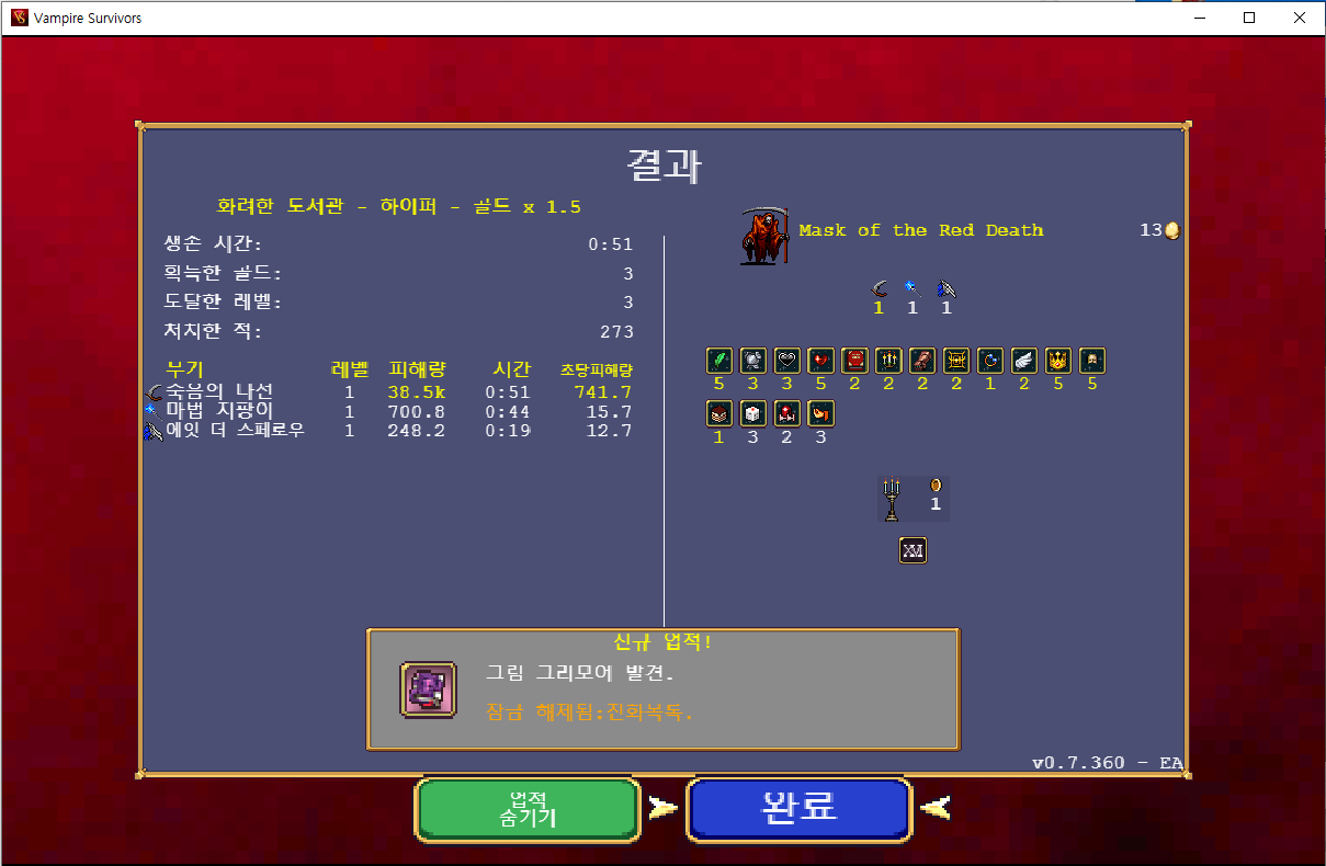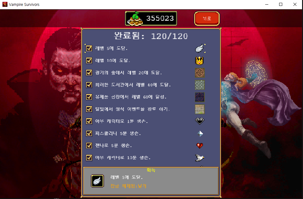 뱀파이어 서바이버즈(Vampire Survivors) 뱀파이어 서바이벌 0.8.0 패치로 변경된점 도전과제(업적) 3개 추가 업적 진행하기 마그다 예배당에서 시작 하자 그리고 케릭터는 Leda 로 시작 몸빵이 좋
