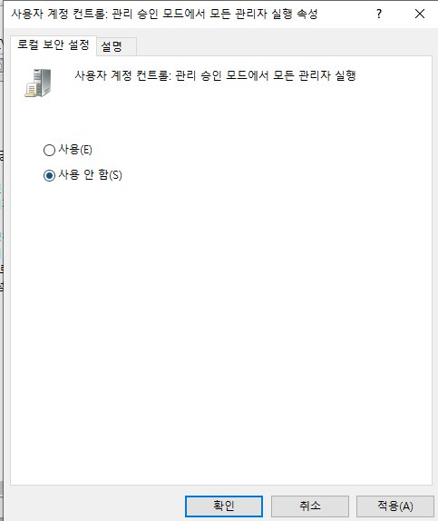 해당 경로에 가서 사용자 계정 컨트롤: 관리 승인 모드에서 모든 관리자 실행 더블클릭