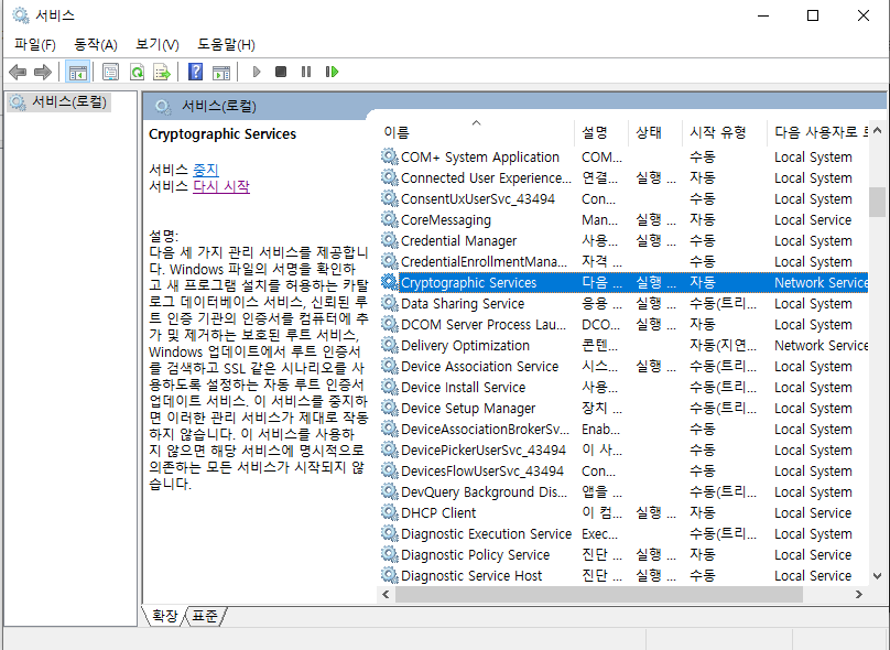 누르고 서비스 재시작을 해주면 차단이 안되고 정상적으로 구동이 될것이다.